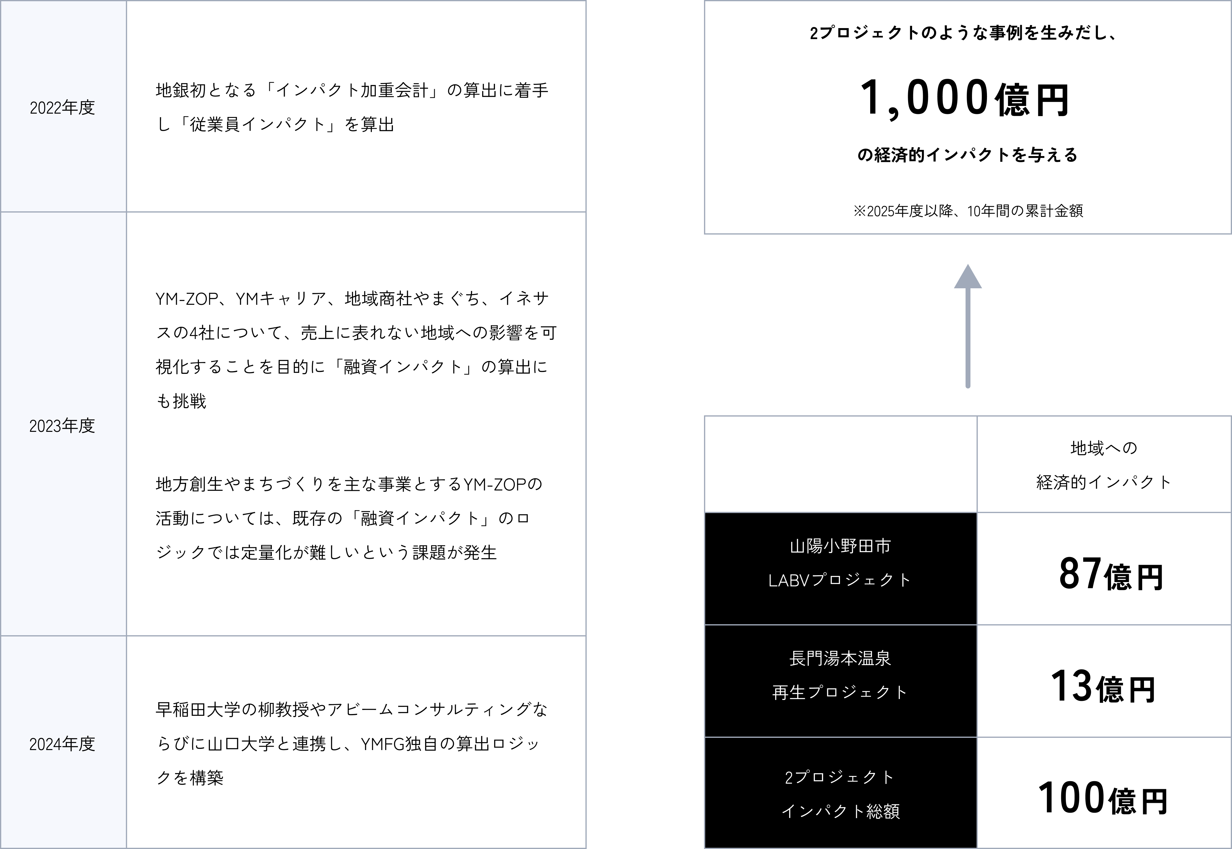 本モデルで当社グループがこれまで取り組んできたプロジェクトの効果を金額換算したところ、「山陽小野田市LABVプロジェクト」は総額87億円、「長門湯本温泉再生プロジェクト」は総額13億円となり、インパクト総額は100億円となりました。(2024年度時点)