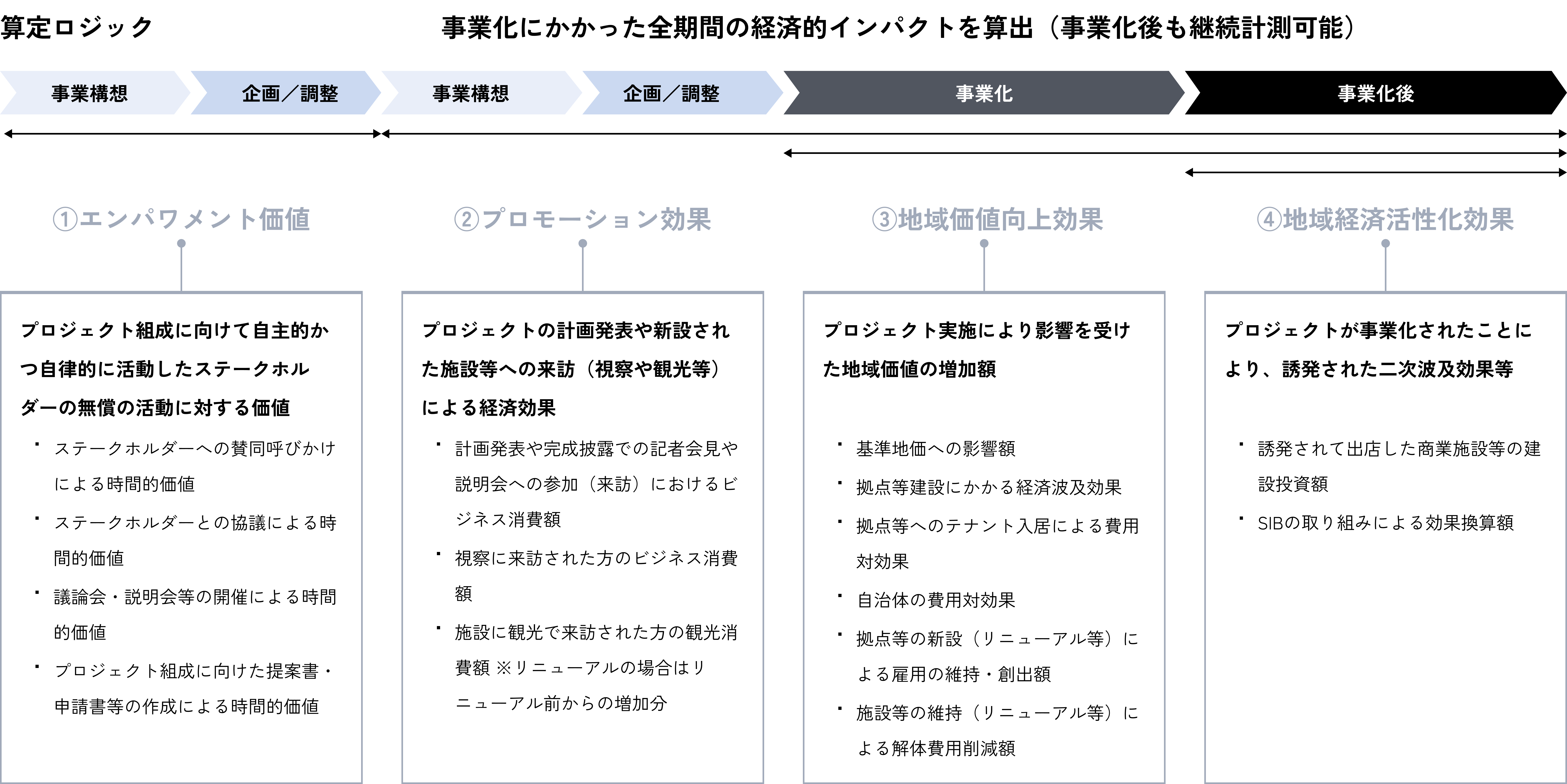 企画段階では、各主体が事業実現に向けて自主的に活動した無償活動の価値(エンパワメント価値)、事業形成段階では視察や観光客増などによる効果(プロモーション効果)を算出します。事業化して以降の効果は、地価への影響を中心とした効果(地域価値向上効果)、近隣への店舗集積などの効果(地域経済活性化効果)を計算し、これら4要素の合計額を「地域との経済的インパクト」として算出します。